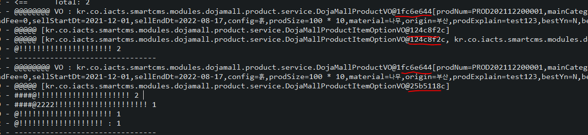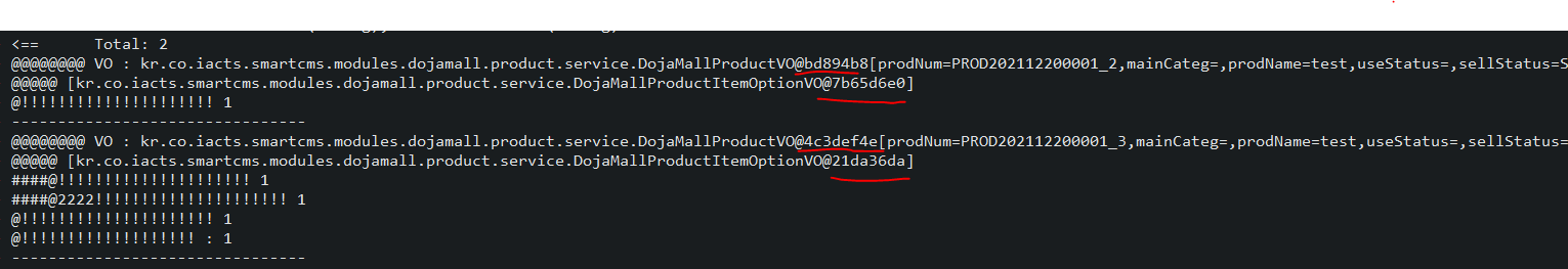 여기서 보면 위에 데이터에서 "@@@@@VO : " 에 해당하는 주소값들이 다르다는 것을 알 수 있다. 즉 DojaMallProductVO 가 다르다는 것 이렇게 되므로써 복사가 완벽하게 이루어짐을 알 수 있다.