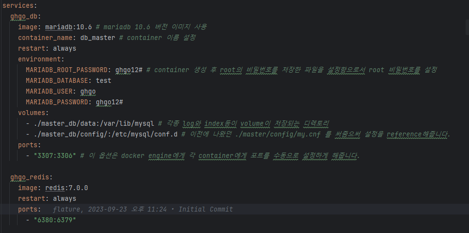 ) 해당 파일에는 db_master 와 redis의 포트가 다릅니다.