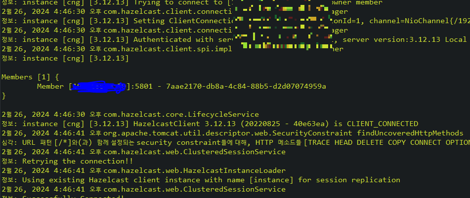 - hazelcast 서버 실행 후 프로젝트 톰켓 실행 결과 화면